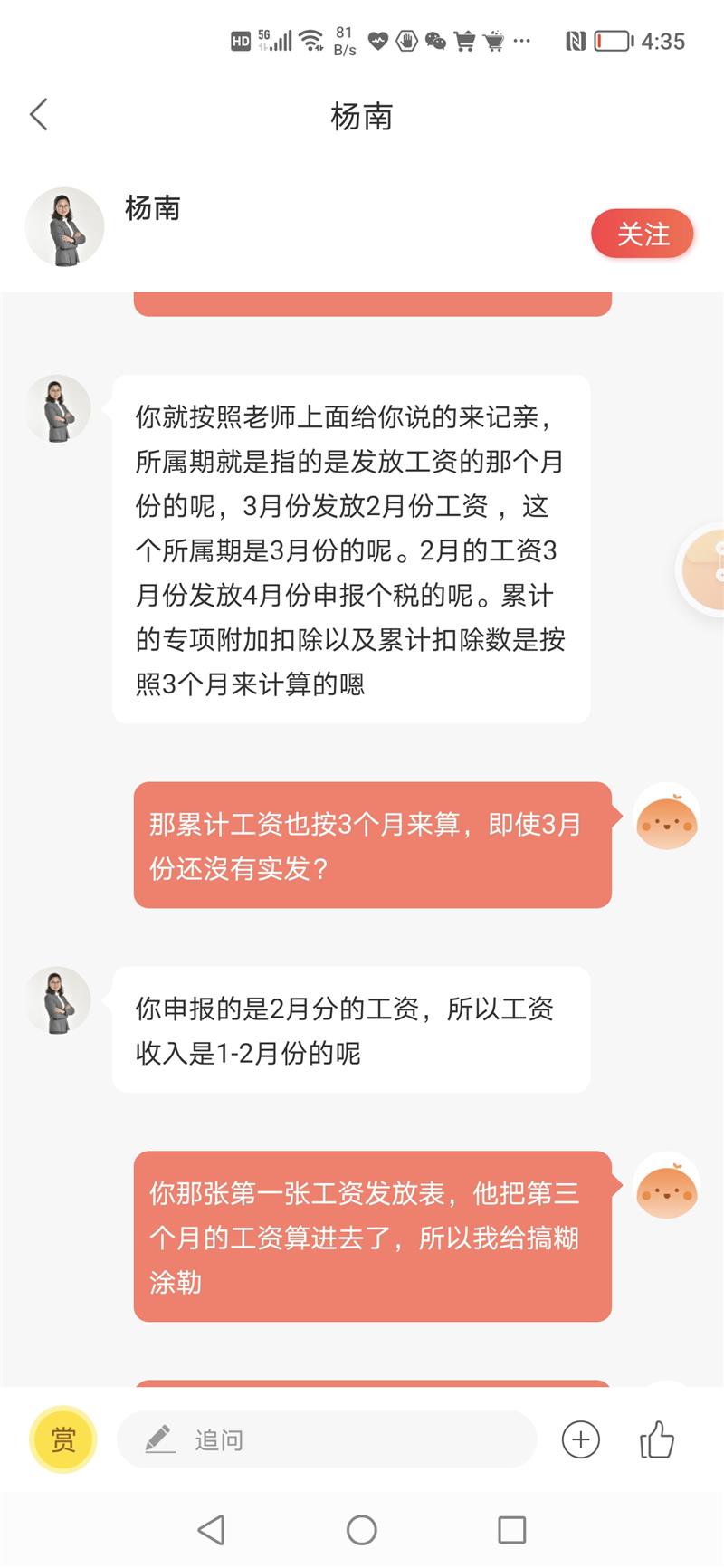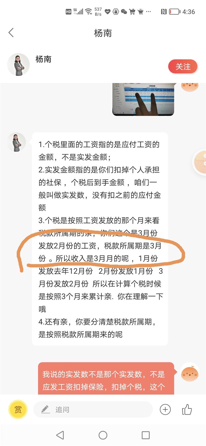 1.个税里面的工资指的是应付工资的金额,不是实发金额; 2.实发金额指的是你们扣掉个人承担的社保 ,个税后到手金额 ,咱们一般叫做实发数,没有扣之前的应付金额 3.个税是按照工资发放的那个月来看税款所属期的亲,你们这个是3月份发放2月份的工资,税款所属期是3月份 。所以收入是3月月的呢 ,1月份发放去年12月份 2月份发放1月份 3月份发放2月份 所以在计算个税时候是按照3个月来累计亲. 你在理解一下哦 4.还有亲,你要分清楚税款所属期,是按照税款所属期来的呢