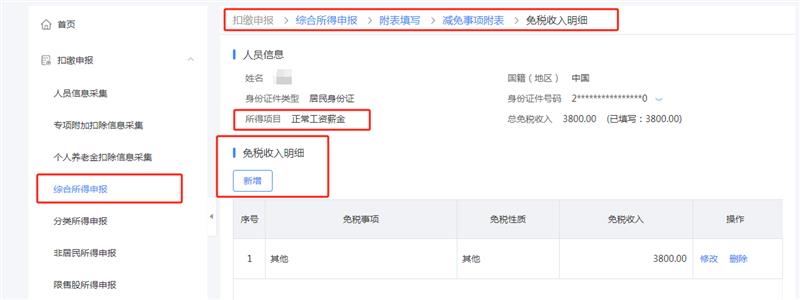 点开人员信息里,有一个免税收入明细,里面有“新增”的免税事项—免税性质—免税收入